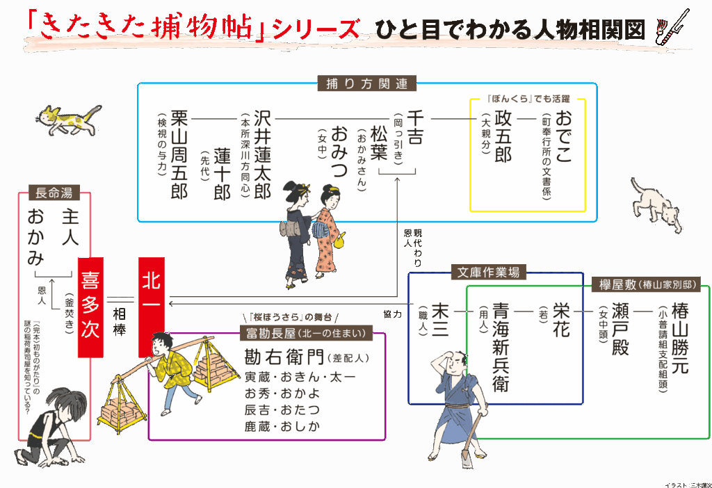「きたきた捕物帖」シリーズの物語を動かすのは、一癖も二癖もある魅力的な登場人物たちです。彼らの関係性を知ることで、物語をより深く理解することができます。