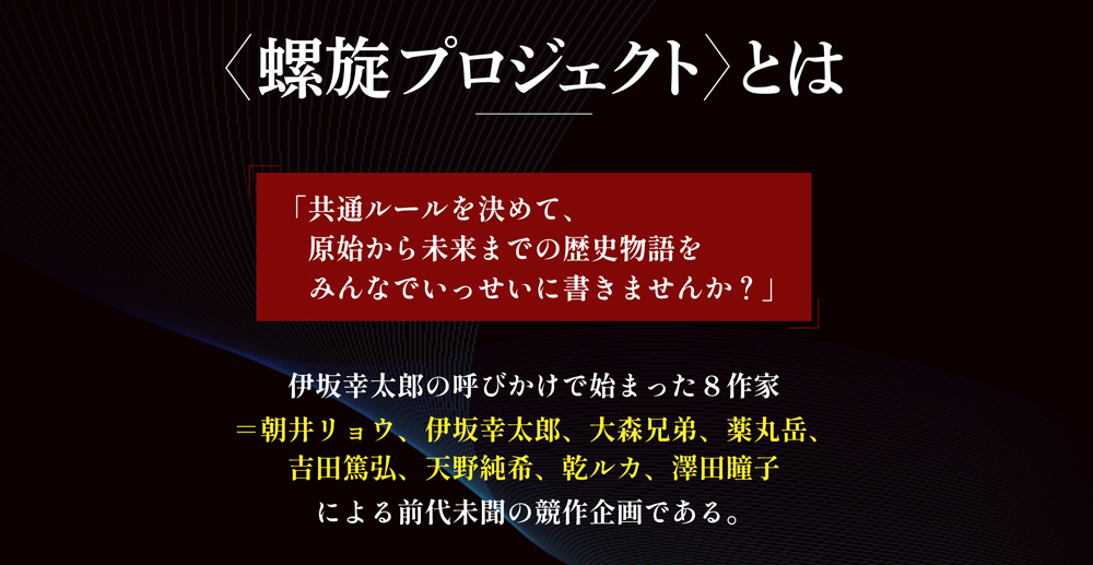 螺旋プロジェクトとは、作家・伊坂幸太郎さんの「共通ルールを決めて、原始から未来までの歴史物語をみんなでいっせいに書きませんか?」という呼びかけから始まった、8組9名の豪華作家による前代未聞の文芸競作企画です。