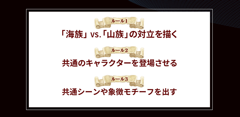 • 「海族 vs 山族」の対立を軸に全作品がゆるやかに繋がる